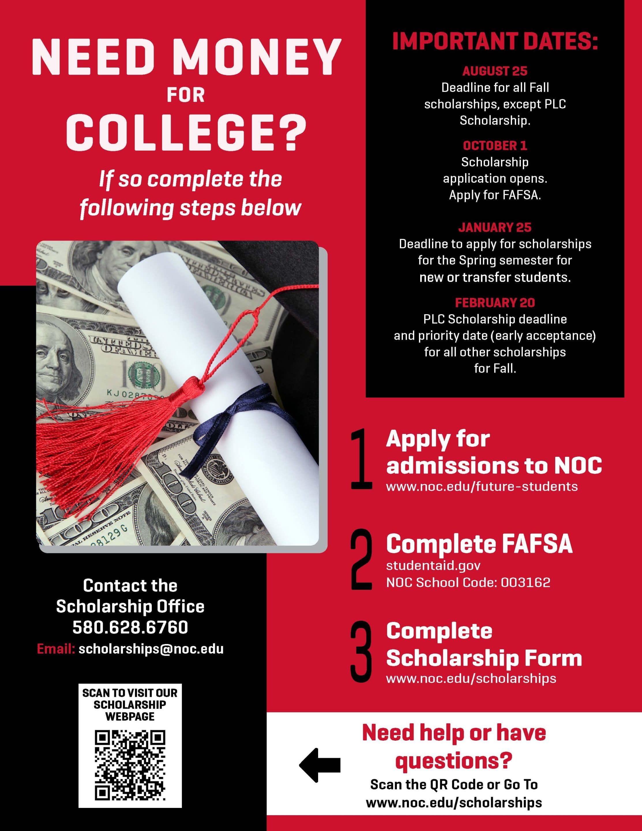 At Northern Oklahoma College, we recognize the importance of a quality education and are dedicated to helping you find a way to achieve your higher education goals. A number of scholarships are awarded annually by the Office of Institutional Scholarships, including Freshman Scholarships for incoming freshmen and Sophomore Scholarships for returning/transfer students. Foundation Scholarships are also awarded each year to new and current students. In addition, External Scholarships are applied directly to students’ NOC billing accounts by the Office of Institutional Scholarships.
