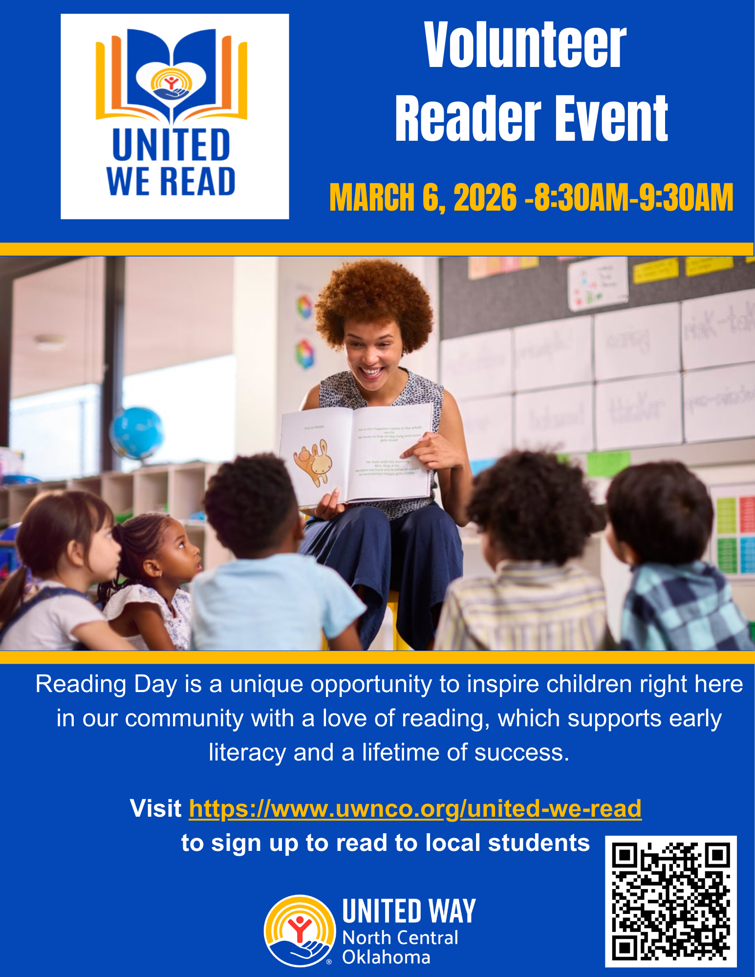 Join us March 6th for United We Read; a new volunteer event that helps kids build a love of reading. We're looking for volunteers to read to elementary school students.